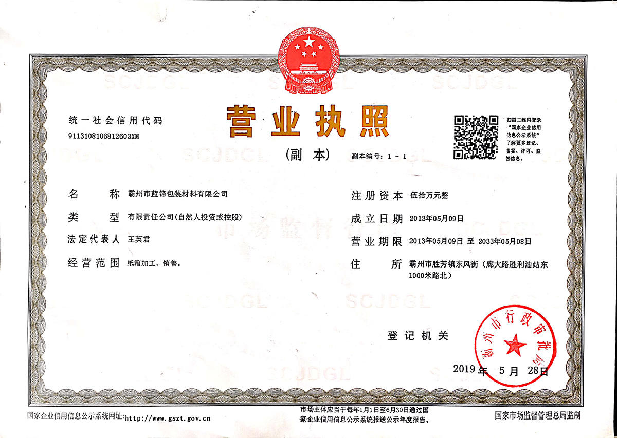 立即咨詢霸州市藍鋒包裝材料有限公司,前身為成立于1988年的勝芳鎮藍劍紙箱廠。是河北省較早涉足紙包裝制品的民營企業。經過近三十年的發(fā)展,公司已經由起初的家庭作坊發(fā)展為現有標準化廠房8000平米,員工50人,其中管理人員7名;年產紙箱上億平米的現代化企業。